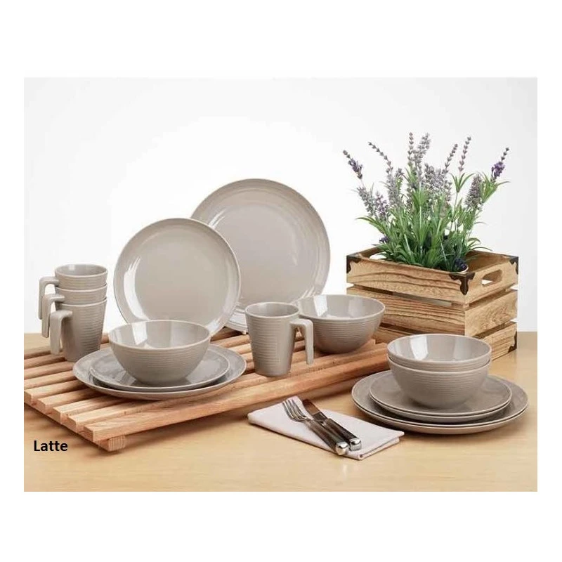 Pack vaisselle mélamine 16 pièces de CAMP4 idéal pour 4 personnes au camping, en bateau ou camping-car. Proposé en coloris Latte ou Vanille.